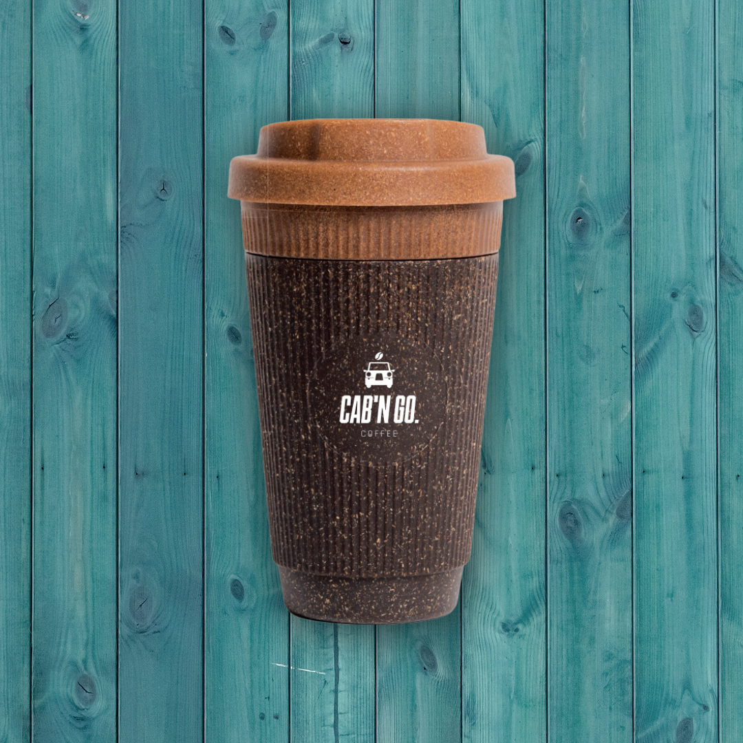 La Cab'N Go Coffee, reciclăm zațul de cafea din cafenelele noastre, pe care îl combinam cu fibre de lemn de fag din sudul Germaniei și polimeri pe bază de plante - fără plastice pe bază de petrol aici!